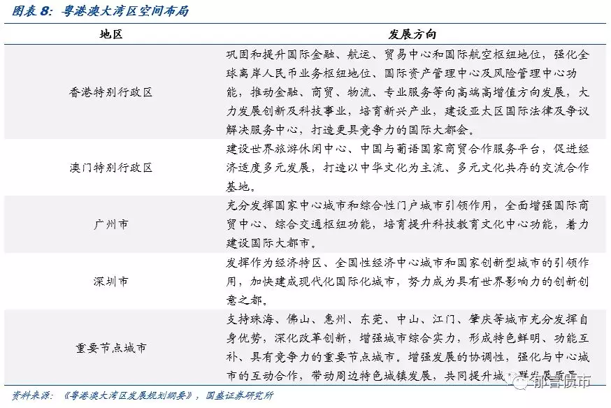 空间布局方面,大湾区发挥港深、广佛、澳珠等城市强强联合的“极点带动“作用、并依托以高速铁路、城际铁路和高等级公路为主体的快速交通网络与港口群和机场群,构建区域经济发展轴带,形成”轴带支撑“、辐射周边,推动大中小城市合理分工、功能互补,进一步提高区域发展协调性,促进城乡融合发展,构建结构科学、集约高效的大湾区发展格局。