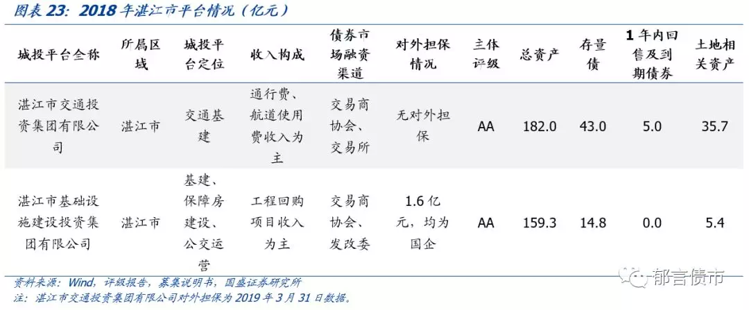 平台概况方面,湛江市2家平台均为市级平台,分别为湛江市基础设施建设投资集团有限公司(以下简称“湛江建投”)和湛江市交通投资集团有限公司(以下简称“湛江交投”)。