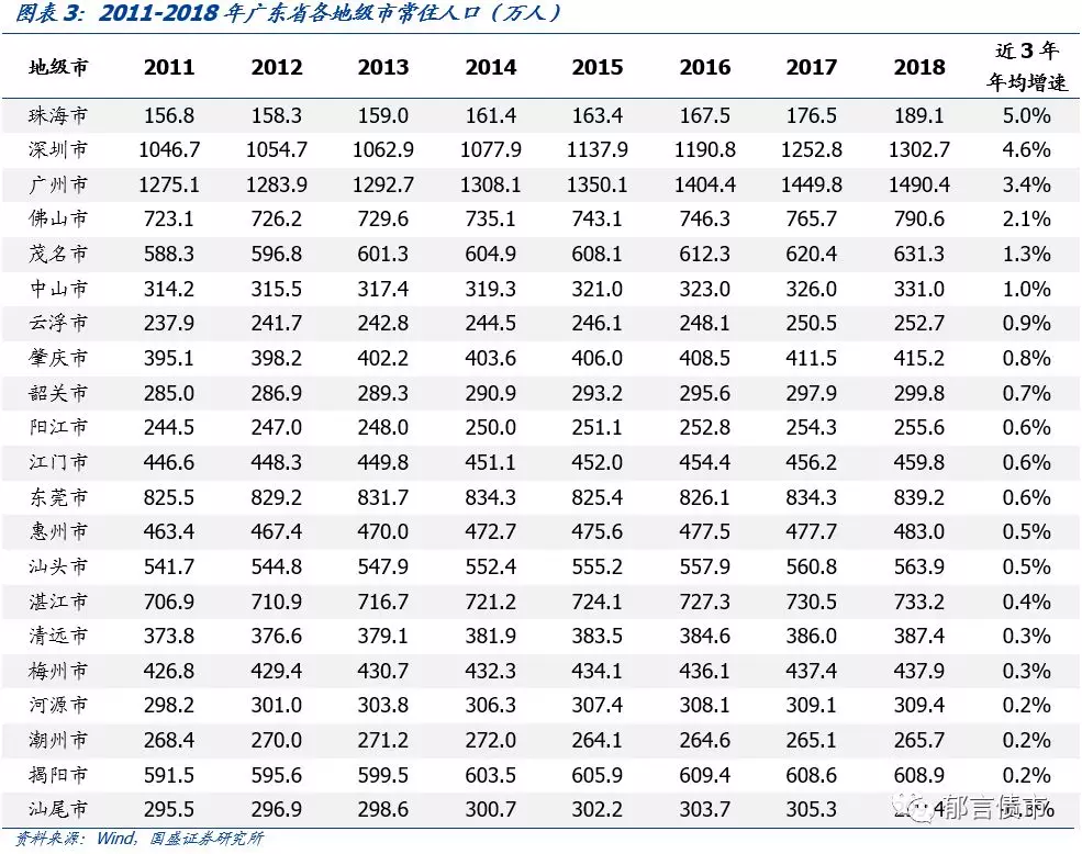 作为珠江口西岸的核心城市,珠海市生态环境良好,地理位置优越,是我国7个经济特区之一,拥有我国第三个国家级新区——横琴新区。随着珠海市加大人才引进力度、放宽落户政策,2018年珠海市常住人口增量首次突破10万人,近3年常住人口年均增速高达5.0%,位居省内第一。深圳市和广州市为一线城市,经济实力雄厚,创新创业环境较好,对人口保持了较强的吸引力,近3年常住人口年均增速分别为4.6%和3.4%。而汕尾市远离广东经济发展核心区域,经济体量较小,发展机会及薪资水平相对于省内部分大城市较少,常住人口近年来首次出现下滑,近3年年均增速为-0.3%。其余各地级市人口均有不同程度增长。