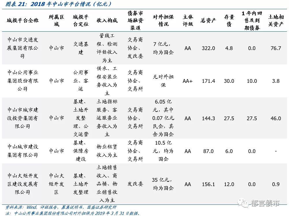 平台概况方面,中山市共有5个平台,其中市级平台4个,区县级平台1个。4个市级平台分别为中山城市建设集团有限公司(以下简称“中山城建”)、中山公用事业集团股份有限公司(以下简称“中山公用”)、中山市城市建设投资集团有限公司(以下简称“中山城投”)和中山市交通发展集团有限公司(以下简称“中山交通”)。