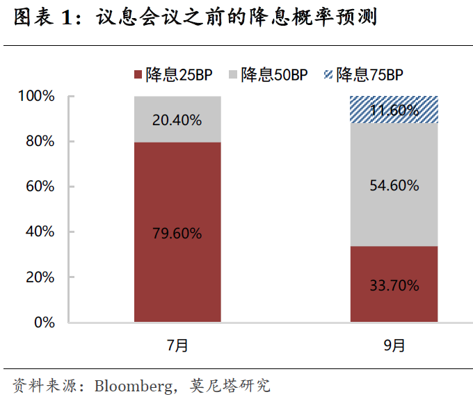 由于美联储在此之前的预期指引,包括鲍威尔在国会听证会的发言以及美联储官员的表态等,市场对本次降息25BP的预期已经十分充分。根据CME的数据,在会议之前,市场对7月降息25BP的预测概率为79.6%,降息50BP的概率为20.4%;9月降息25BP的概率为33.7%,降息50BP的概率为54.6%,降息75BP的概率为11.6%(9月份的概率为累计值,不是当月值)(图表1)。因此,本次降息时间与幅度完全符合市场预期,但是本次会议并没有点阵图,没有给出未来的利率指引。