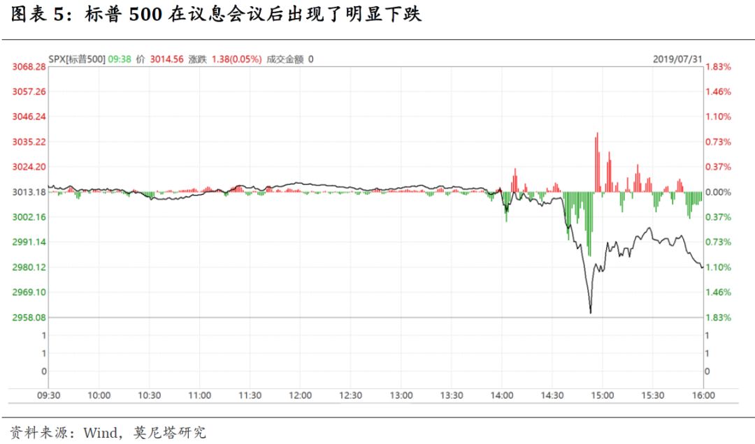 议息会议结束后,美股出现了非常迅速的下跌,收盘标普500指数下跌了1.09%,纳斯达克指数下跌了1.19%(图表5)。股市迅速下跌的原因有以下几点:(1)市场此前的预期已经十分充分,因此政策预期落地;(2)有两位美联储官员表态不支持降息,其中一位还是美联储的元老级人物,市场对未来降息的前景有所淡化;(3)新闻发布会上,鲍威尔的表态偏中性,否认这是宽松周期的开始。从CME的数据看,议息会议结束后,9月份保持利率在2%-2.25%不变的概率从33.7%上升到36.8%,再降息25BP到1.75%-2%的概率从54.6%上升到63.2%,再降息50BP的概率从11.6%降为0(图表6)。