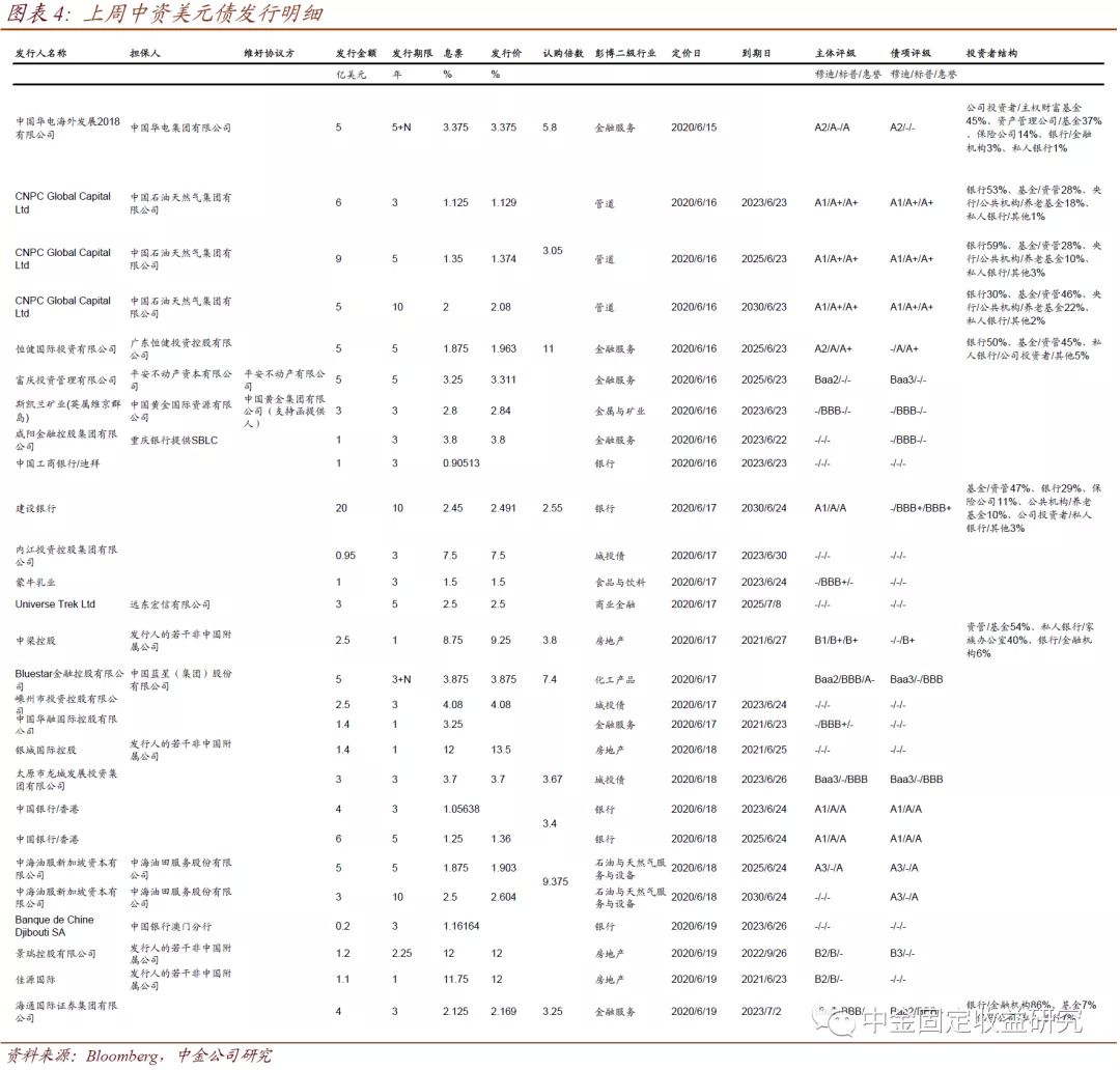 (3)金融方面:本周中国建设银行发行10NC5期限的美元二级资本债,发行金额总计20亿美元。因二级资本属性,本次新债债项评级较主体评级低两档为BBB+。本次新债初始价为T5+250bps区间,最终发行价为T5+215bps,最终获得了来自亚洲和EMEA等地共计51亿美元的订单量,投资者类型上资产管理公司/基金占比最高达47%,银行占比29%、保险占比11%、公共机构/养老基金占比10%。中国银行香港分行本周分别定价3年期和5年期新债合计10亿美元,其中3年期为浮息品种发行价在3mL+75bps,5年期为固息品种,发行价在T5+103bps(发行到期收益率1.36%),最终订单量合计34亿美元,不过一半为承销商订单。海通国际本周发行3年期新债4亿美元,认购方主要为银行/金融机构(占比86%),最终发行价为T3+195bps(2.169%),较初始价收窄40bp左右。另外,投资控股型公司广东恒健以担保结构发行5年期新债5亿美元(债项评级标普/惠誉:A/A+),获得了11倍的高额认购,发行价较初始价大幅收窄60bp,最终发行价仅T+160bps(发行收益率1.963%)。