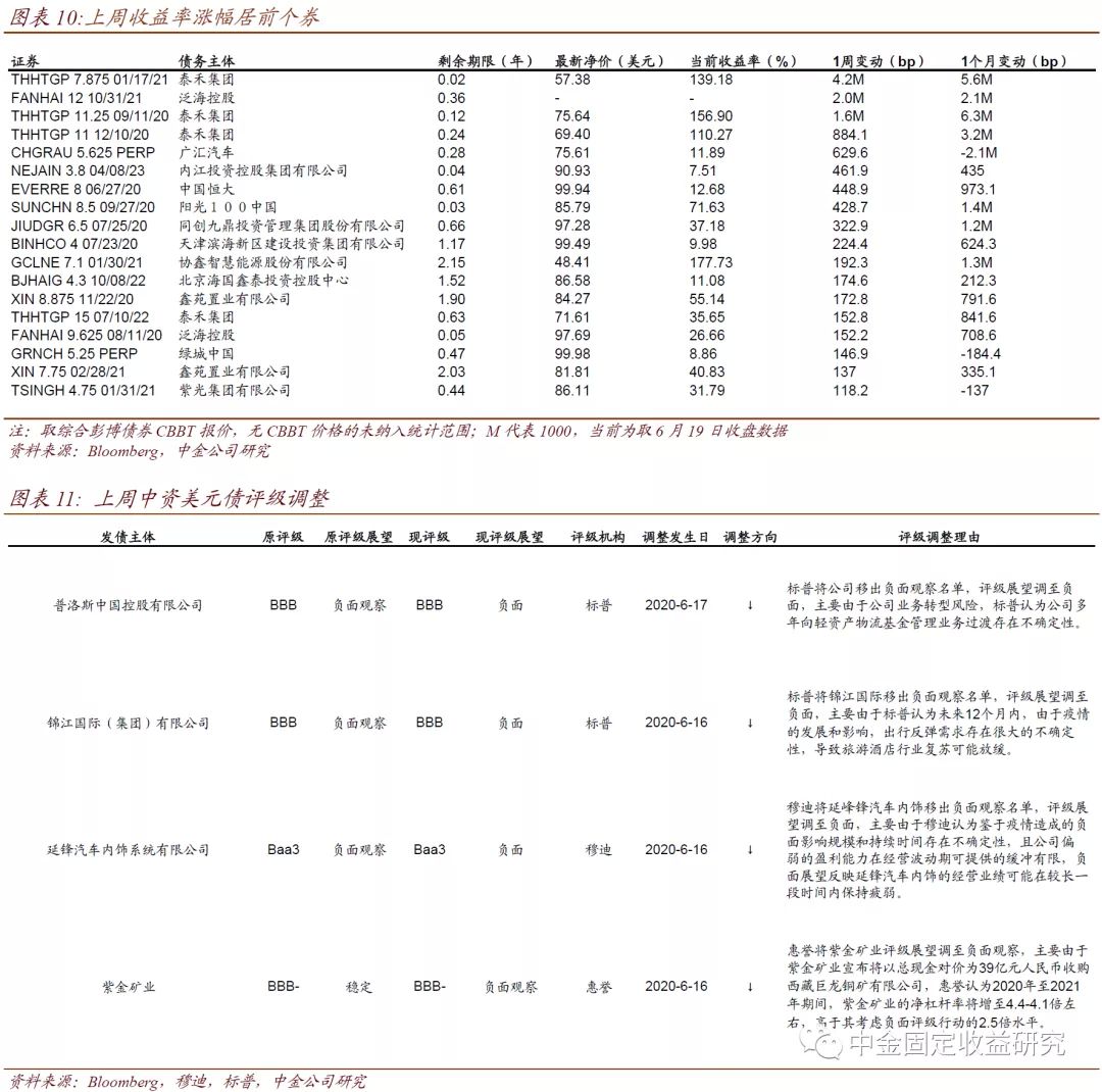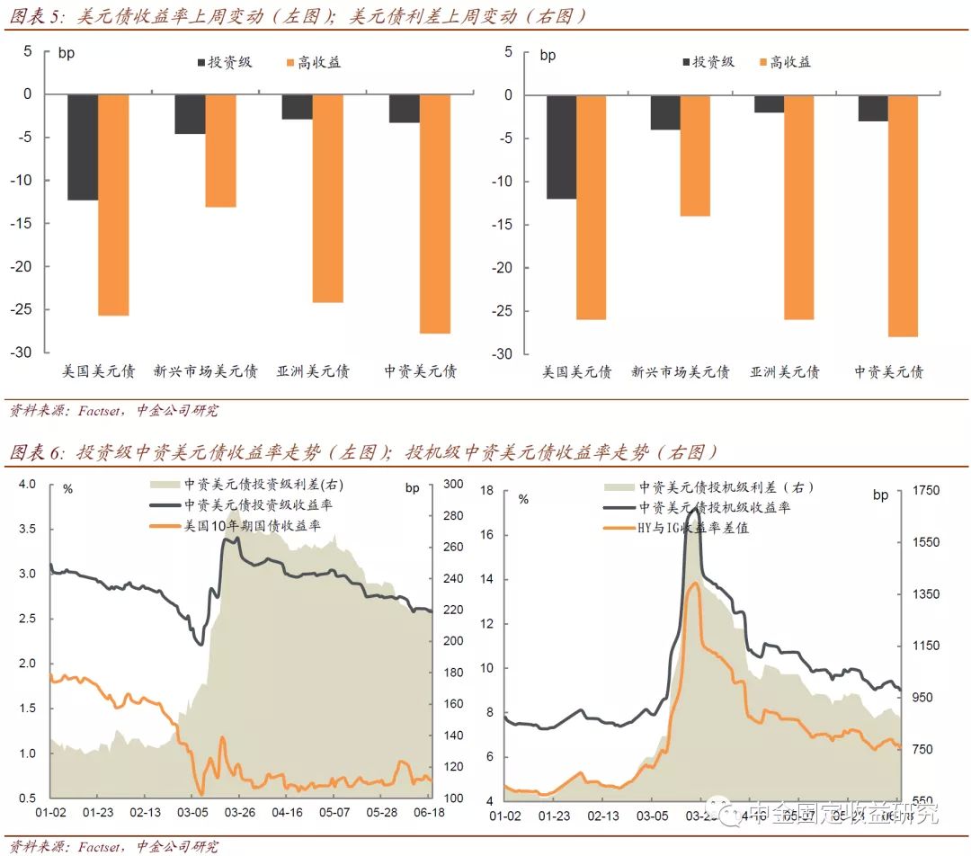 上周受益于政策的继续支持和数据的向好,美国公司债收益率和利差整体下行。政策方面,美联储主席上周表示经济修复仍面临巨大不确定性,美联储也开启此前宣布的二级市场直接购买信用债操作,表明货币政策宽松仍将维持,不过上周美联储资产负债表总规模出现3月以来第一周净减少,主要由于回购和货币互换减少所致,考虑到回购和互换多为短期操作、海内外美元流动性已整体缓解,且并非购买资产规模减少,因此也不反映美联储主动缩表。数据方面,上周美国零售销售数据公布,5月环比增长近18%,好于市场预期。受益于此,美国公司债投资级和投机级利差分别收窄12bp和26bp。