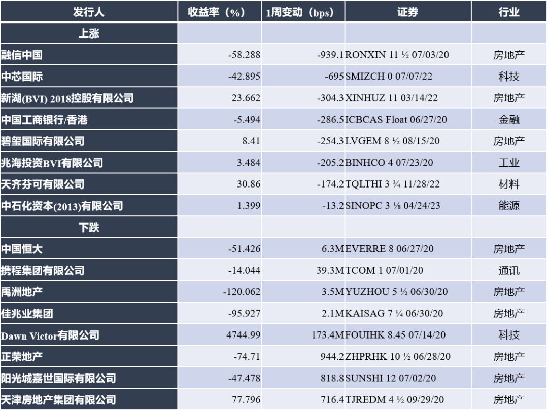 上周一级市场发行规模大幅回落,美元债新发10只,增发2只,总规模40.27亿美元,地产商发行为主。二级市场投资级、高收益名字普涨,无评级名字跌幅明显;行业方面,工业、能源板块领涨,科技、通讯板块领跌。