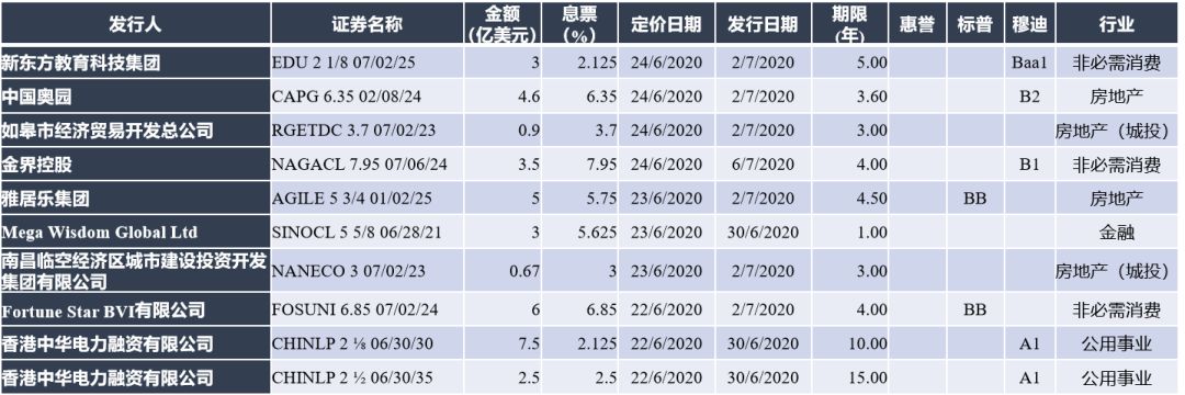本周一级市场发行规模大幅回落,美元债新发10只,增发2只,总规模40.27亿美元,地产商发行为主。地产商新发2只,增发2只,总规模13.2亿美元,其中蓝光发展(和骏顺泽投资有限公司)增发2亿美元,定价10.55%,为本周唯一一笔定价超过10%的债券;公用事业板块中华电力发行的10年期7.5亿美元债,定价2.281%,总认购超4倍,为本周最大发行规模;金融机构新发1只,定价5.625%,规模3亿美元。