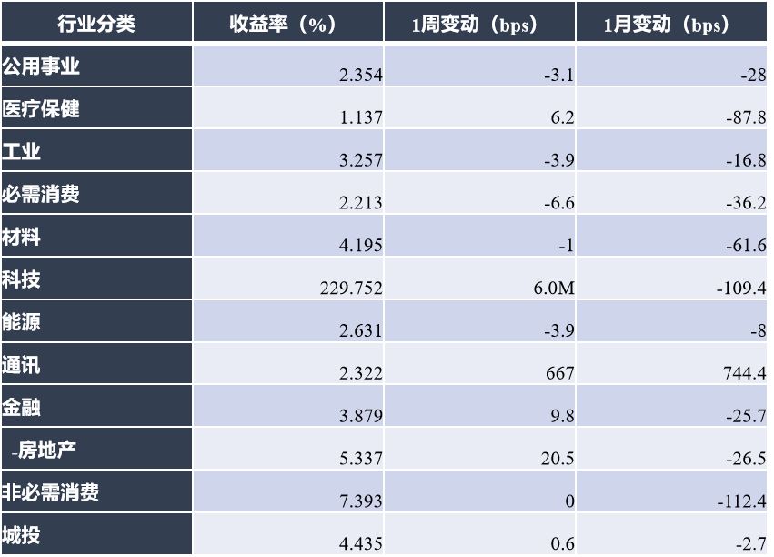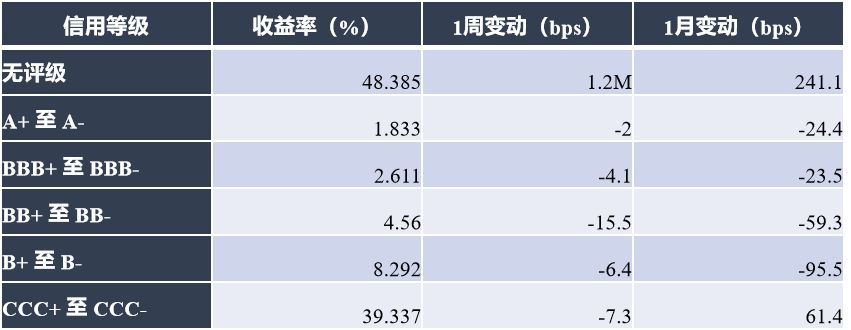 投资级名字小幅上涨,A、BBB等级收益率分别下行约2bps、4.1bps;高收益名字普遍上涨,BB、B、CCC等级收益率分别下行约15.5bps、6.4bps、7.3bps;无评级名字跌幅明显,收益率上行近1.2Mbps。