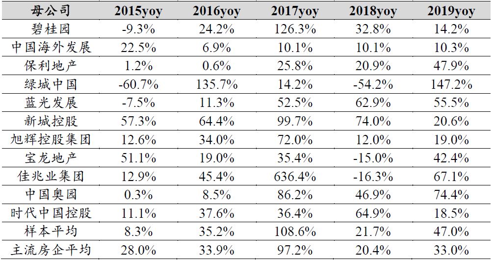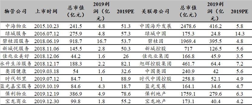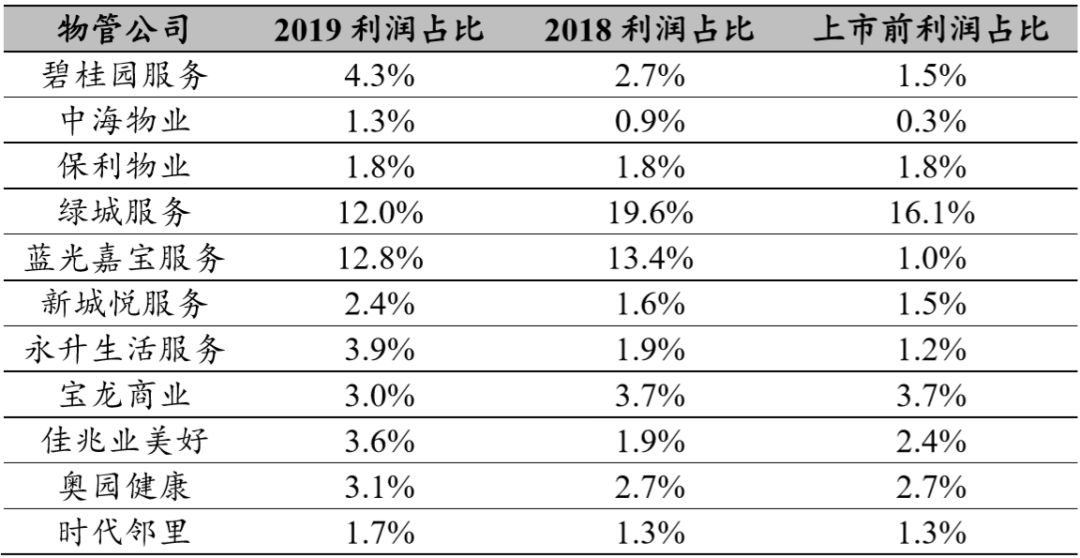 从利润角度来看,物业管理公司占母公司利润比重普遍不大。从2017-2019年总口径净利润数据来看,除绿城服务在其上市前净利润占母公司净利润10%以上外,其余物业公司在上市前净利润占母公司净利润比重都在4%及以下,其在被分拆上市时对母公司利润变化的影响较小,因此近几年母公司净利润增速变动主要是由于行业整体增速有所调整所致,而非由于拆分物业子公司导致。