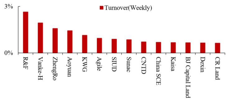 图 15:富力地产、万科H、正荣地产本周换手率居前