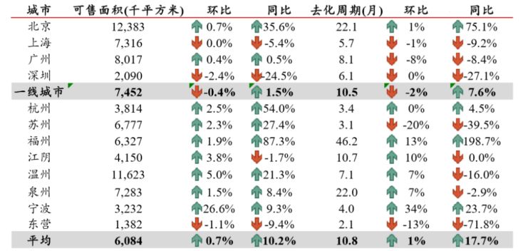 表 9:主要城市新房库存与去化周期情况,去化周期环比小幅上升