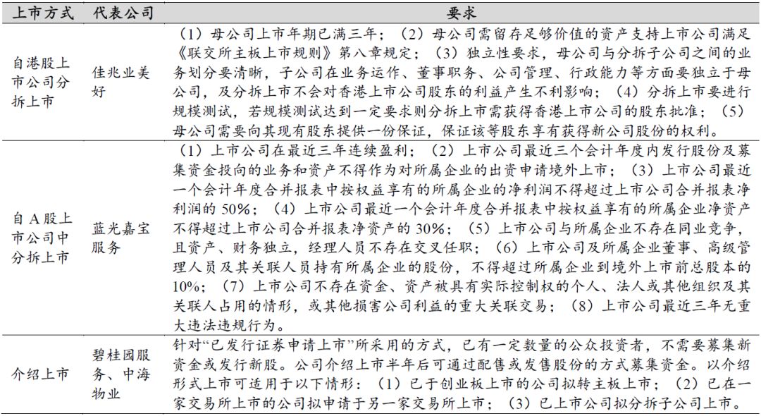 表 4:目前物业子公司分拆上市主要有三种