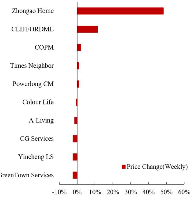 本周,中奥到家、祈福生活服务、中海物业本周涨幅居前。中奥到家、银城生活服务、永升生活服务年初至今涨幅居前。