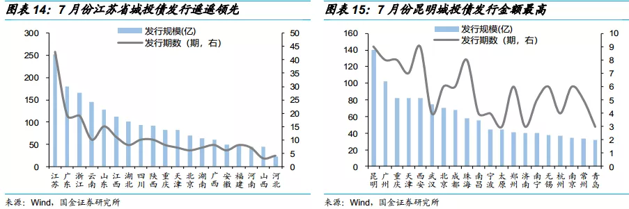 从城投债发行主体分布区域看,7月份新发行的城投债中,江苏省发行规模仍保持领先地位,为253亿元,占总发行金额13.17%,列发行省份第一位。此外,广东、浙江、云南、山东、江西、湖北、四川、陕西、重庆、天津、北京、湖南、广西发行金额均超过60亿元。城市分布方面,除直辖市外,昆明、广州、天津发行规模位列前三,发行金额均超过80亿元,其中昆明市的发行额最高,达到140亿元。