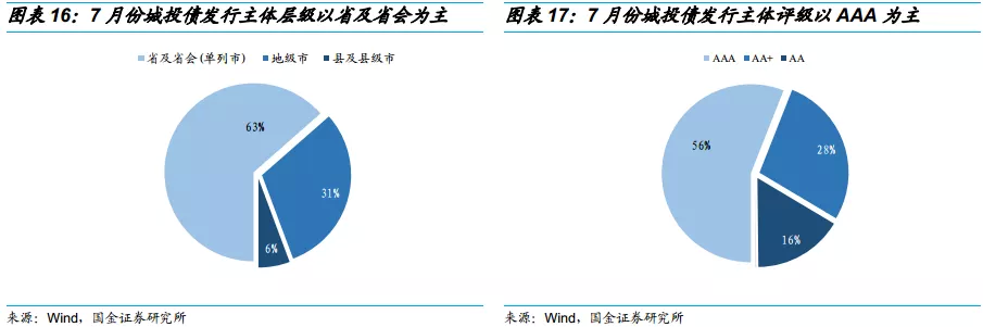 发行城投层级方面,7月省及省会(单列市)发行城投债金额占比过半,发行规模为1,216.91亿元,占比为63.52%,地级市的发行规模占比为30.79%;发行主体信用评级以AAA和AA+为主,AAA级的发行金额为1,072.53亿元,占比55.99%。