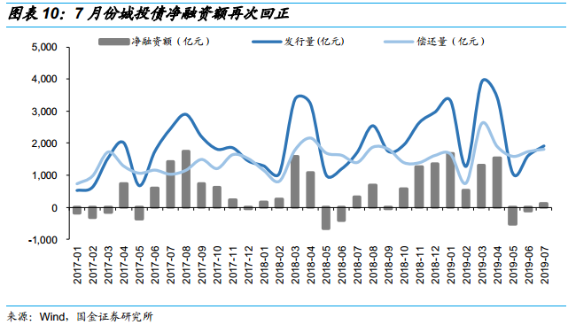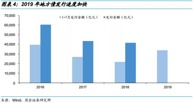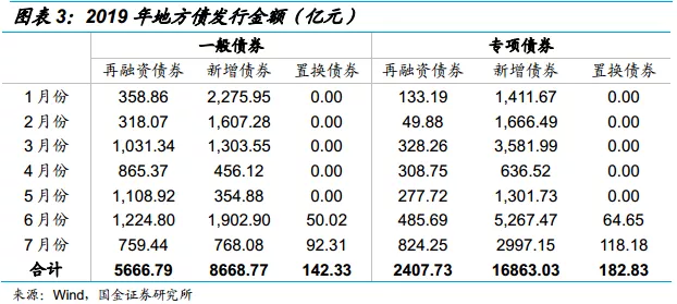 根据财政部披露,截至2019年1月末,非政府债券形式存量政府债务还有3,151亿元,假设这3,151亿元债务均于今年置换为政府债券,7月份已发行210.49亿元,8-12月每月仍需发行565.17亿元。但根据2019年《政府工作报告》中“继续发行一定数量的地方政府置换债券,减轻地方利息负担”,后续不排除在债务限额内继续发行置换债置换或有债务。