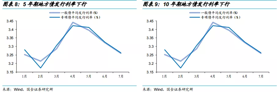 7月地方债发行利率继续下行。5年期一般债平均发行利率为3.26%,专项债平均发行利率为3.27%,较6月平均发行利率均回落6bp;10年期一般债平均发行利率为3.43%,专项债平均发行利率为3.42%,较6月份分别回落7bp和10bp。