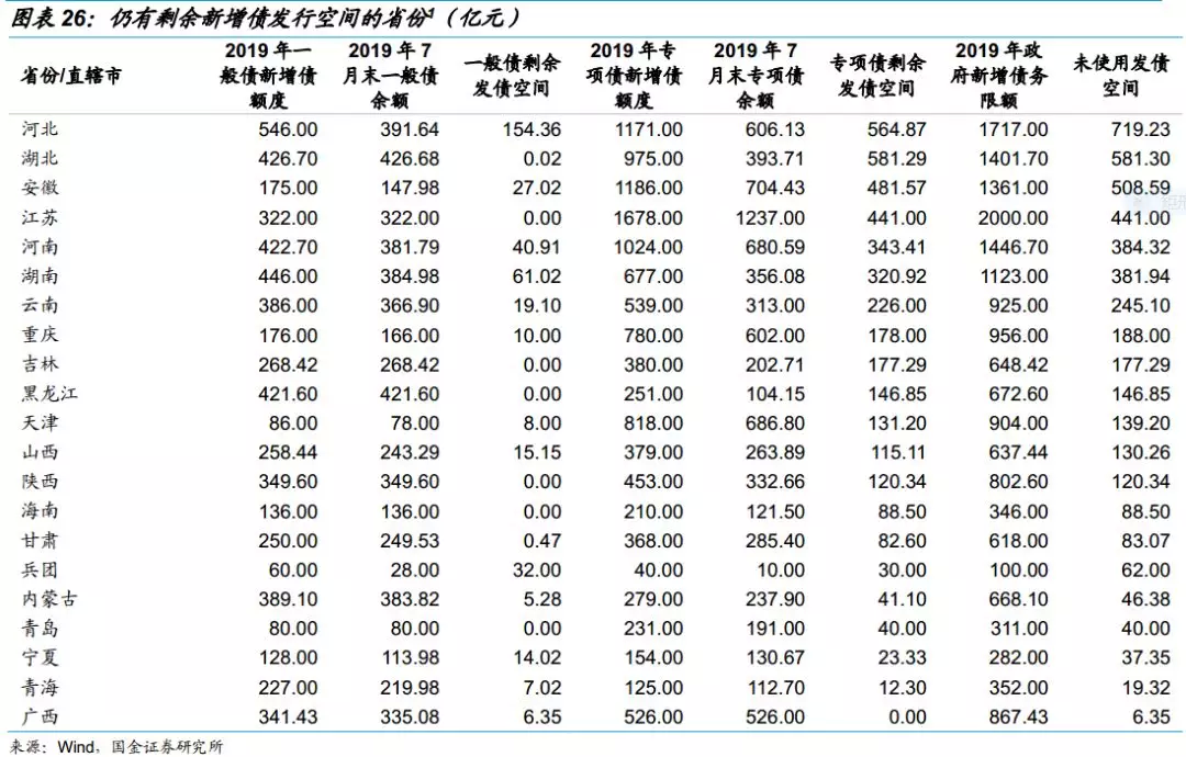 2019年1-7月,各省份新增一般债共发行8,668.77亿元,新增专项债共发行16,863.03亿元,从各省份的发行进度来看,河北省、湖北省、安徽省、江苏省、河南省剩余发债空间排名前五,多个省份全年新增发债额度已使用完毕。另外,我们对年内地方债发行规模进行测算,总体来看,7月份新增地方债发行规模冲高回落,但仍处于高位,年内地方债供给压力在一定程度上有所缓解。