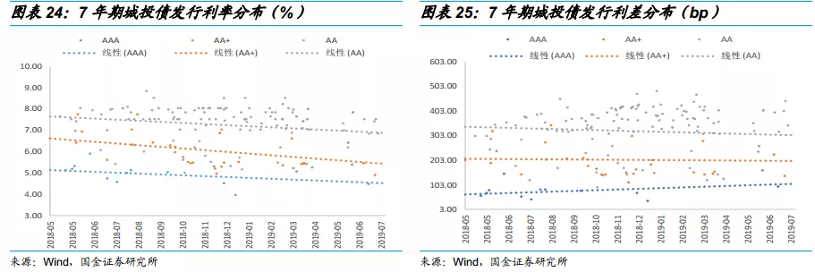 城投债发行利率及利差方面,7月城投债发行利率基本回落,利差较上月有所收窄。7月份,1年期城投债AAA、AA+级和AA级城投债发行利率与信用利差保持明显下行趋势;3年期城投债发行利率与1年期表现相同,但是下行与收窄程度稍弱;5年期城投债AA+级发行利率回落幅度快于AAA级和AA级城投债,AAA级城投债发行利差基本维持稳定未变;7年期城投债发行利率整体呈现下行趋势,发行利差走势分化,AA+、AA级利差有下行趋势,AAA级利差走阔。
