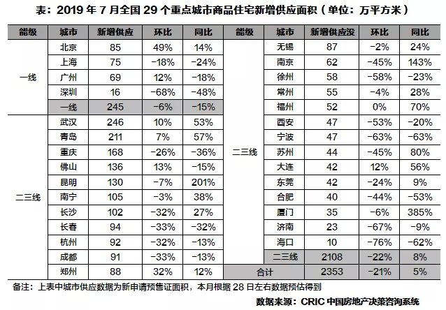 29个重点城市整体新增供应疲软,7月新增供应面积仅2353万平方米,环比锐减21%,同比微升5%。环比下滑的主要原因有二,一方面是受周期性因素影响,在年中6月业绩冲刺大量推货之后,7月推盘节奏必然放缓;另一方面,去年下半年房企拿地量不足也致使房企近期供货乏力。