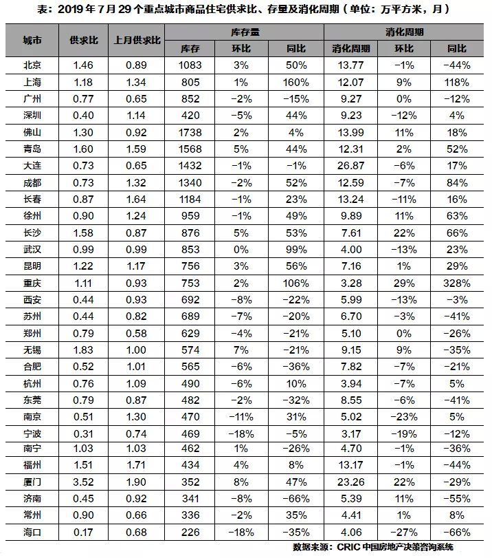 7月,由于重点城市供应缩量,大部分城市商品住宅供求比有所回落,深圳、西安、苏州、宁波等6市供求比低于0.5,特别是海口降至仅0.17,当前市场供不应求态势严重。受此影响,近6成城市库存量环比回落,宁波、海口皆下滑18%跌幅最为显著,但基于成交不振,整体来看库存同比仍是涨多跌少。