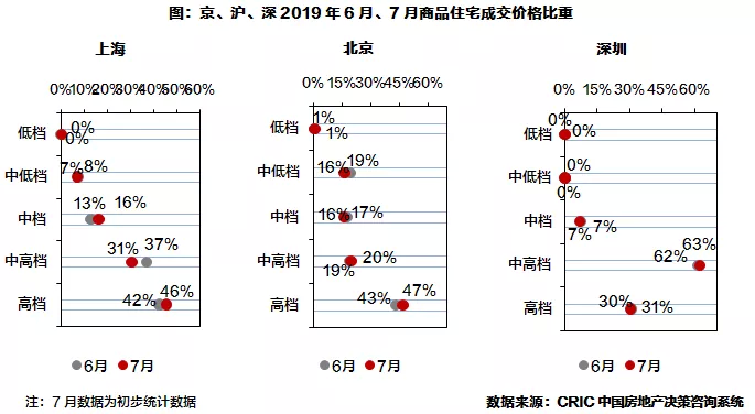 从价格段分布来看,本月各城市成交结构较上月相比变化均不明显。其中上海中高档产品成交占比小幅下跌6个百分点;北京中低档、中档产品占比略有回落,合计下降5个百分点;京、沪高档产品占比皆有回升,但增幅均不超过5个百分点。而深圳各类型产品成交占比基本与上月持平,中高档产品环比微涨1个百分点仍是市场绝对成交主力。