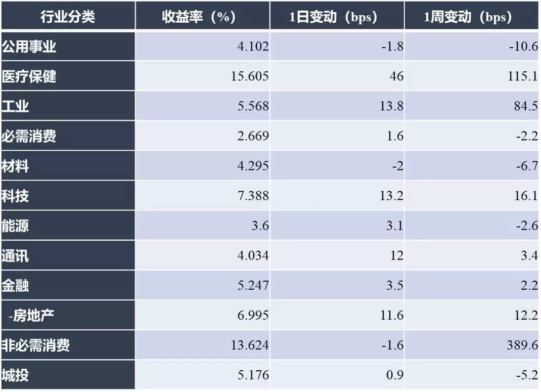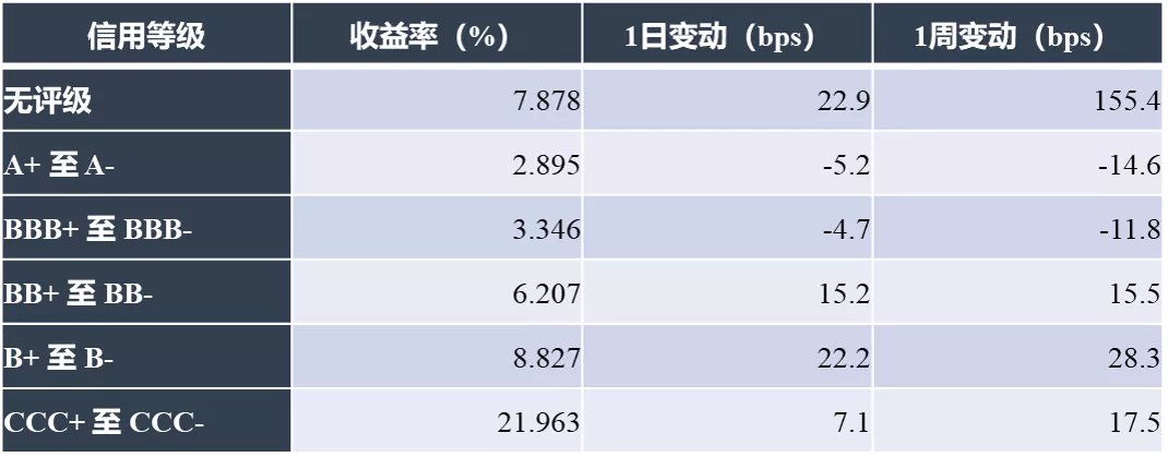 投资级名字上涨,A、BBB等级收益率下行约11.8bps~14.6bps;高收益名字普跌,其中B等级跌幅最大,收益率上行约28.3bps,BB、CCC等级跌势稍缓,收益率分别上行15.5bps、17.5bps左右;无评级名字大跌,收益率上行近155.4bps。