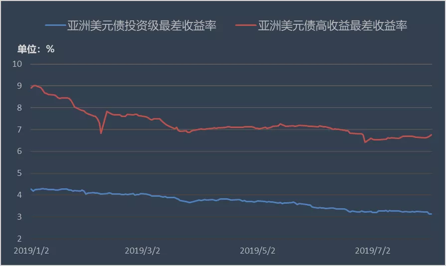 亚洲美元债投资级最差收益率3.1281%,较上周下行12.36bp,高收益最差收益率6.7601%,较上周上行11.63bp。