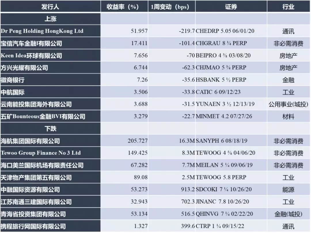 行业方面,公用事业、材料板块小幅领涨,非必需消费、工业板块领跌。公用事业板块主要受云南能投集团等名字上涨的影响,收益率下行约10.6bps;材料板块主要受五矿有色金属(五矿Bounteous金融BVI有限公司)等名字上涨的影响,收益率下行约6.7bps;非必需消费板块主要受海航系公司、天津物产集团(Tewoo Group Finance No 3 Ltd)等名字下跌的影响,收益率上行近389.6bps;工业板块主要受天津物产集团、江苏南通三建等名字下跌的影响,收益率上行84.5bps左右。