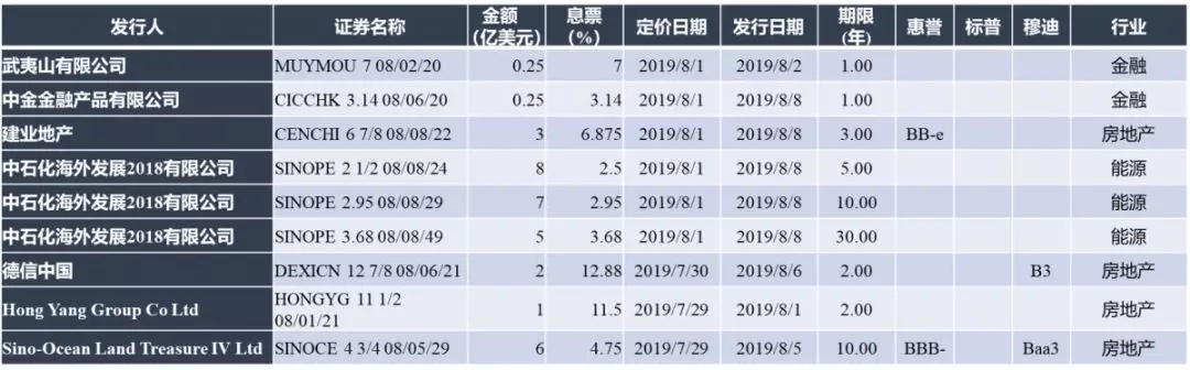 一级市场美元债新发9只,增发1只,总规模35亿美元,发行规模较上周有所下降,能源公司和地产商发行为主。能源板块中石化发行3笔合计20亿美元,由于其垄断性行业地位,受到了海内外投资者的广泛认可,获逾43亿美元认购,为本周最大发行规模。地产板块新发3只,增发1只,总规模14.5亿美元,其中德信中国发行2亿美元,定价14%,为本周定价最高的新发债券,此外,弘阳国际发行1亿美元,定价11.5%,亦超过10%。