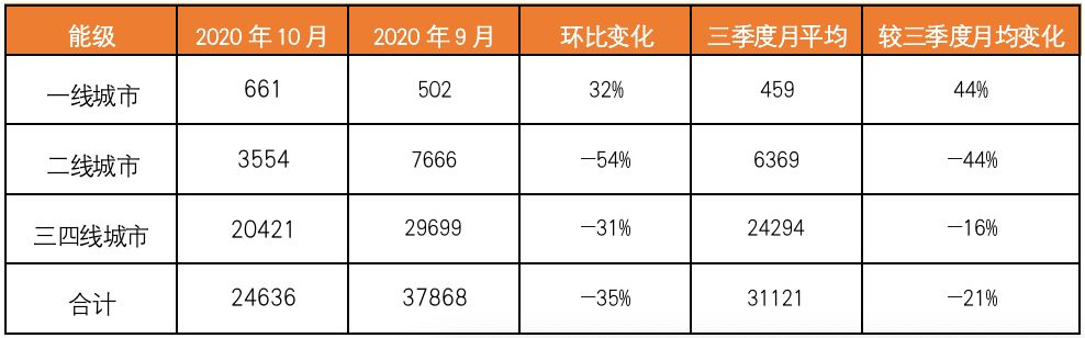 表:2020年10月各能级城市土地供应变化情况(万平方米)