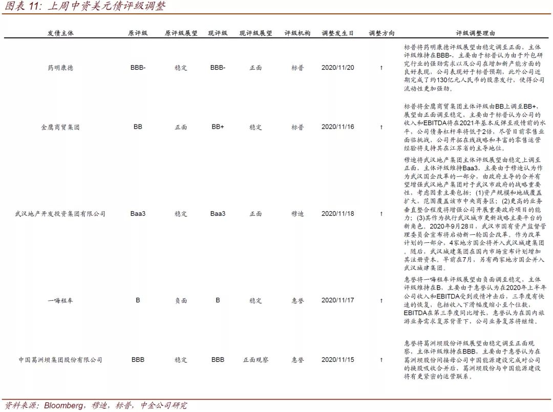 上周无新增负面评级主体。上周正面评级主体为药明康德、金鹰商贸集团、武汉地产集团、一嗨租车和葛洲坝股份。标普将药明康德评级展望由稳定调至正面,主体评级维持在BBB-,主要由于标普认为由于外包研究行业需求强劲需求且公司不断增加了新产能,此外公司近期完成股票增发后流动性更加充裕;标普将金鹰商贸集团主体评级由BB上调至BB+,展望由正面调至稳定,主要由于标普认为公司的收入和EBITDA将在2021年基本反弹至疫情前的水平,公司债务杠杆率将低于2倍,仍将维持在江苏省零售业的主导地位;穆迪将武汉地产集团主体评级展望由稳定上调至正面,主体评级维持Baa3,主要由于穆迪认为作为武汉国企改革的一部分,由政府主导的合并有望增强公司对于武汉市政府的战略重要性;惠誉将一嗨租车评级展望由负面调至稳定,主体评级维持在B,主要由于惠誉认为公司三季度收入和EBITDA恢复明显;惠誉将葛洲坝股份评级展望由稳定调至正面观察,主体评级维持在BBB,主要由于惠誉认为在中国能源建设完成对公司的换股吸收合并后,葛洲坝股份与中国能源建设将有更紧密的运营联系。