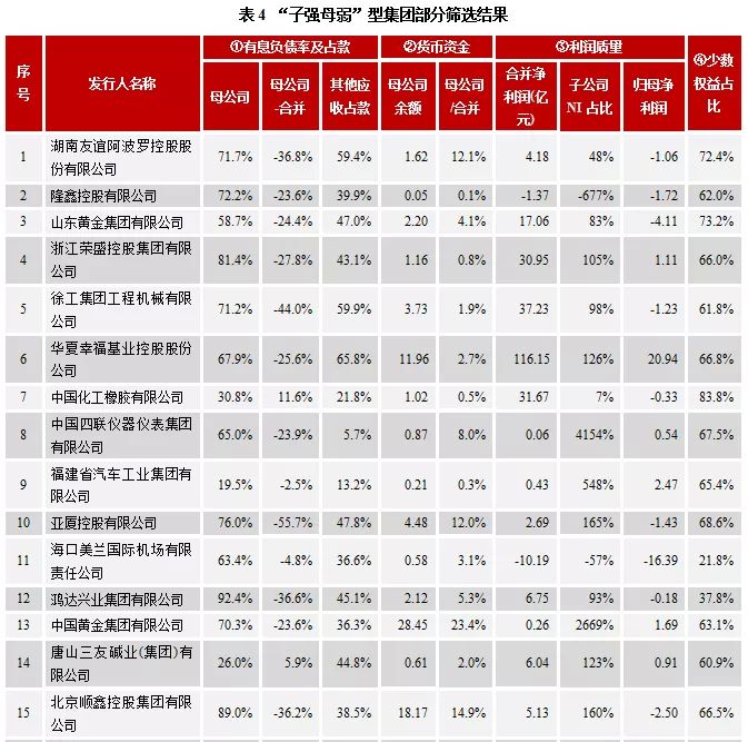 本文根据债务结构、流动性、盈利质量、控制力等方面从截至10月末存量债券产业债集团主体中进行筛选,共筛选出189家“子强母弱”型集团公司,51%的主体为AAA级别;其中28家在以上财务方面多项表现弱势。