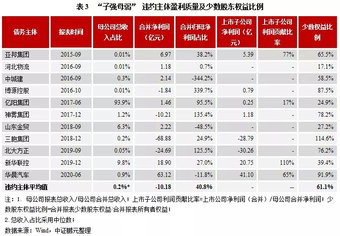 本文对截止2020年10月末有存续债券的产业债集团发行主体,根据母公司负债和占款水平、母公司现金水平、非上市部分盈利质量,以及少数股东权益等以下指标进行“子强母弱”筛选[2],为确保“子强”属性,发行主体需满足“母公司为非上市公司,上市子公司净利润合计超过2亿元”: