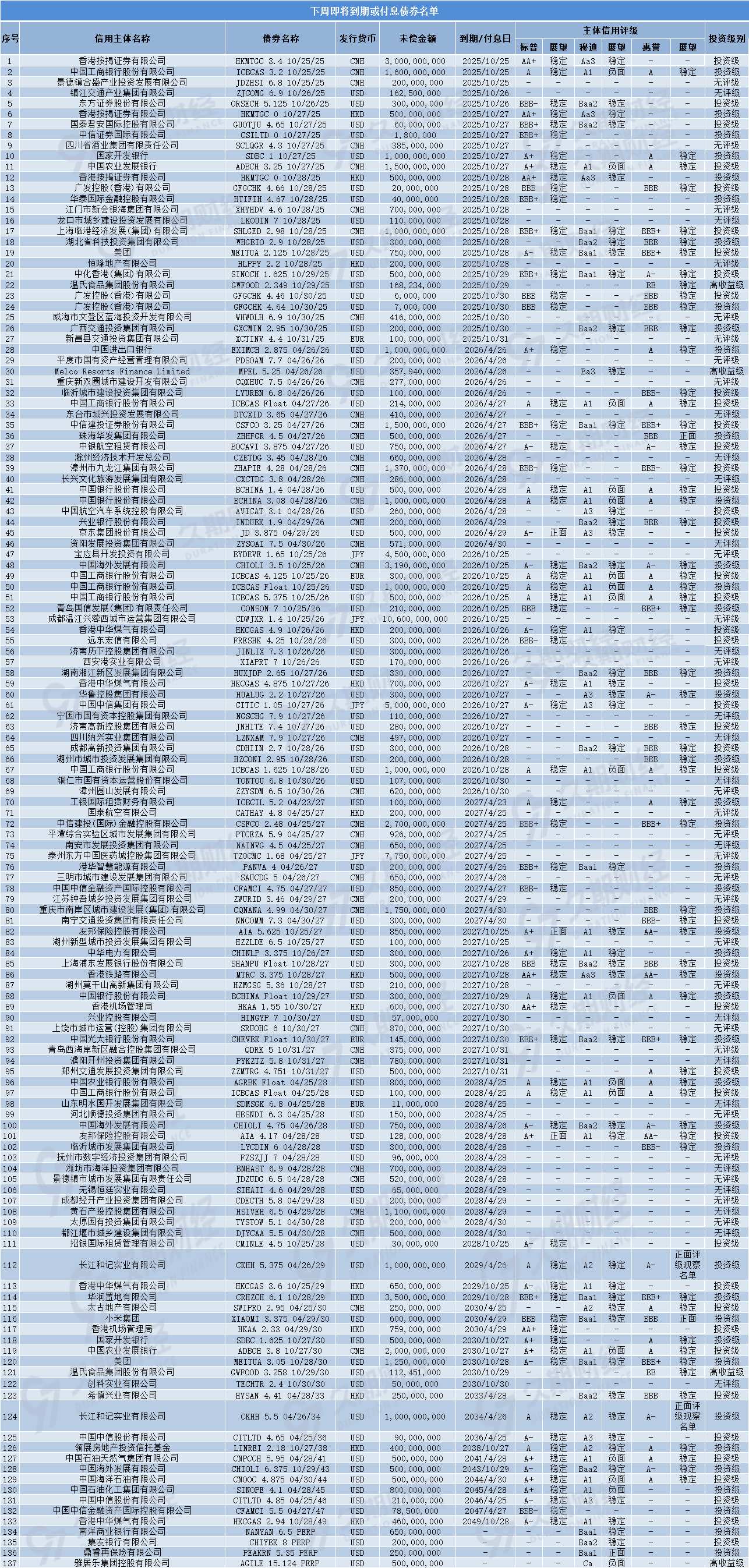 久期财经讯,据统计,下周(10月25日-10月31日)有137只债券即将付息/到期。