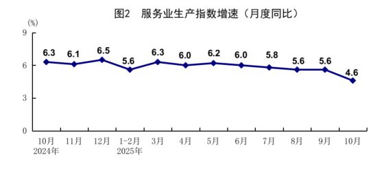 10月份,全国服务业生产指数同比增长4.6%。分行业看,信息传输、软件和信息技术服务业,租赁和商务服务业,金融业生产指数同比分别增长13.0%、8.2%、5.6%,分别快于服务业生产指数8.4、3.6、1.0个百分点。1-10月份,全国服务业生产指数同比增长5.7%。1-9月份,规模以上服务业企业营业收入同比增长7.6%。10月份,服务业商务活动指数为50.2%,服务业业务活动预期指数为56.1%。其中,铁路运输、航空运输、邮政、住宿、文化体育娱乐等行业商务活动指数位于60.0%及以上高位景气区间。