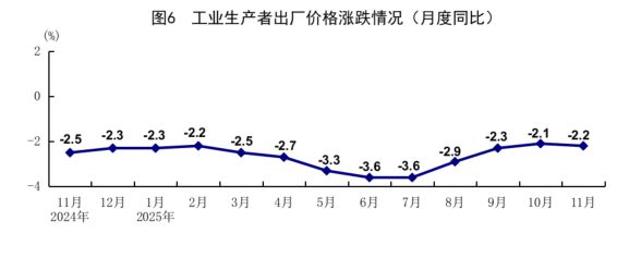 11月份,全国工业生产者出厂价格同比下降2.2%,环比上涨0.1%;全国工业生产者购进价格同比下降2.5%,环比上涨0.1%。1-11月份,全国工业生产者出厂价格和购进价格同比分别下降2.7%、3.1%。