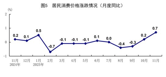 11月份,全国居民消费价格(CPI)同比上涨0.7%,涨幅比上月扩大0.5个百分点;环比下降0.1%。分类别看,食品烟酒价格同比上涨0.3%,衣着价格上涨1.9%,居住价格持平,生活用品及服务价格上涨2.1%,交通通信价格下降2.3%,教育文化娱乐价格上涨0.8%,医疗保健价格上涨1.6%,其他用品及服务价格上涨14.2%。在食品烟酒价格中,猪肉价格下降15.0%,粮食价格下降0.4%,鲜果价格上涨0.7%,鲜菜价格上涨14.5%。扣除食品和能源价格后的核心CPI同比上涨1.2%。1-11月份,全国居民消费价格同比持平。