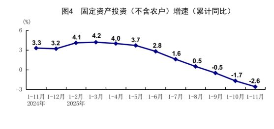 1-11月份,全国固定资产投资(不含农户)444035亿元,同比下降2.6%;扣除房地产开发投资,全国固定资产投资增长0.8%。分领域看,基础设施投资同比下降1.1%,制造业投资增长1.9%,房地产开发投资下降15.9%。全国新建商品房销售面积78702万平方米,同比下降7.8%;新建商品房销售额75130亿元,下降11.1%。分产业看,第一产业投资同比增长2.7%,第二产业投资增长3.9%,第三产业投资下降6.3%。民间投资同比下降5.3%;扣除房地产开发投资,民间投资下降0.7%。高技术产业中,信息服务业,航空、航天器及设备制造业投资同比分别增长29.6%、19.7%。11月份,固定资产投资(不含农户)环比下降1.03%。