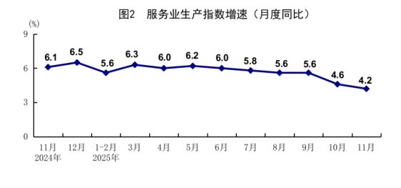 11月份,全国服务业生产指数同比增长4.2%。分行业看,信息传输、软件和信息技术服务业,租赁和商务服务业,金融业生产指数同比分别增长12.9%、8.4%、5.1%,分别快于服务业生产指数8.7、4.2、0.9个百分点。1-11月份,全国服务业生产指数同比增长5.6%。1-10月份,规模以上服务业企业营业收入同比增长7.6%。11月份,服务业商务活动指数为49.5%,服务业业务活动预期指数为55.9%。其中,铁路运输、电信广播电视及卫星传输服务、货币金融服务等行业商务活动指数位于55.0%以上较高景气区间。