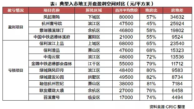 就已经入市的13个典型地王项目来看,根据测算地价房价比值处于45%-82%不等,房地差在4494-34632元/平方米之间。盈利空间较大的项目集中在下城区和滨江区,并且是拿地较早的项目,多早于2016年6月,其中凤起潮鸣、杭州壹号院两个项目的房地差均超2.5万元/平方米,地房比均在57%以下,盈利空间十分可观。