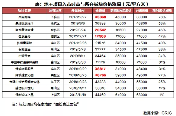 就盈利情况来看,拿地之时,13宗地王项目有5宗“面粉”贵于“面包”,最为典型的当属“踩点”拿地的绿城凤起潮鸣项目,该宗地在2016年3月竞得,尽管当时拿地之处楼板价较当时周边房价还要贵368元/平方米;但由于项目区位优越,加之项目定位高端,又恰好赶上了杭州房价快速上涨的窗口期,2017年底项目开盘价达80000元/平方米,较拿地时的周边房价上涨了78%,房地差也接近了34632元/平方米,盈利空间可期。