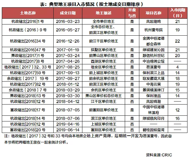 根据CRIC统计,截止2019年11月18日,近八成地王已经入市,入市项目的平均入市周期达15.6个月,超过全国平均入市周期10个月左右。就已入市的单个地块来看,入市最快的是临安区单价地王项目——苕溪壹号,拍地之后4个月就开盘,该项目拿地楼板价高达12506元/平方米,溢价率高达55%,这与临安当时的规划利好和杭州楼市的高热不退以及临安相对宽松的调控政策息息相关,这场土拍是在临安撤县设区后的半月内拍下的,行政区划调整后,临安的楼市热闹非凡,杭州市区、嘉兴、温州的炒房团蜂拥而至,临安的房价迎来了新一轮的上涨契机,因此,土拍热度明显上涨。由于市场高预期,为了搭上顺风车,房企加快了入市的进度,仅仅4个月就开盘;首开平均销售均价17000元/平方米,剔除建安、营销等成本,项目肯定是要亏的,目前房价涨至22450元/平方米,能稍有盈利空间。而入市最为缓慢的地王是前江干区单价地王——金隅中铁诺德都会森林,拿地之后22个月才首开,其余入市项目开发周期均在1-2年之间,大部分地王的开发节奏较为缓慢。