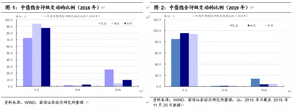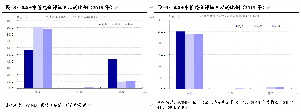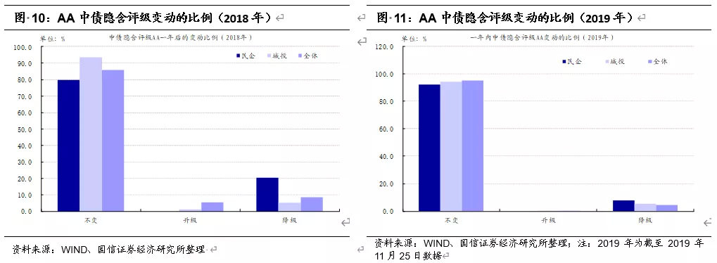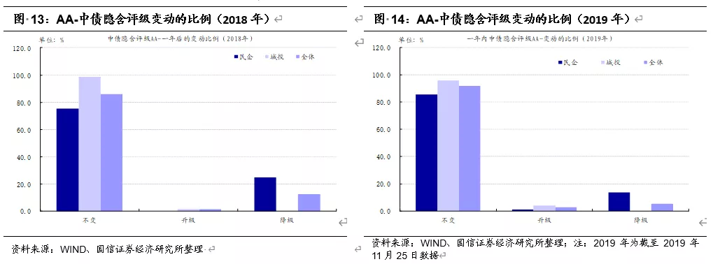 初始中债市场隐含评级AA-的债券中,2018年下调的比例为12.4%,2019年为5.5%。