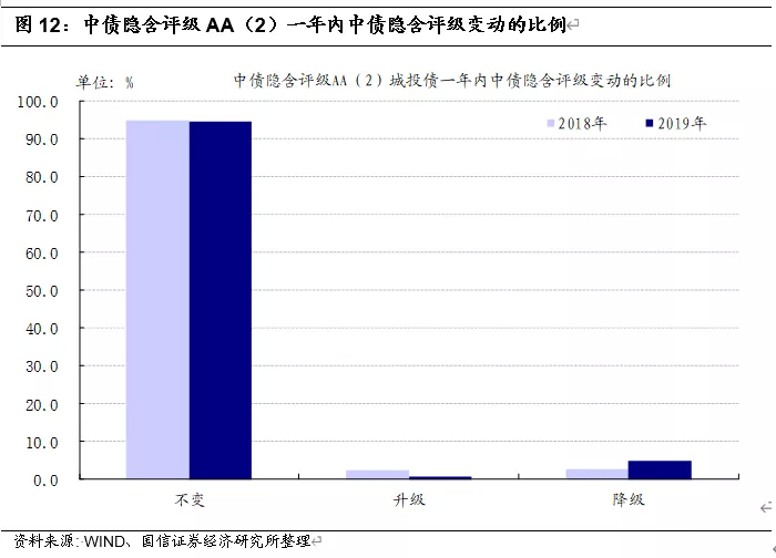 然后城投债AA(2)中债市场隐含评级中,2018年降级比例为2.8%,2019年为4.9%。