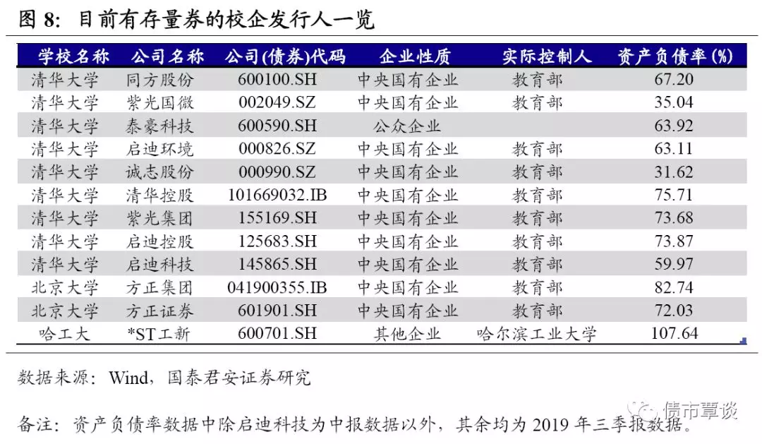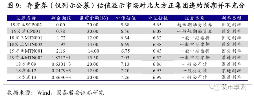 (2)市场对北大方正集团本期超短融违约预期并不充分,违约的后续影响可能超越市场预期。2019年10月底清华紫光、北大方正美元债暴跌已经反映了境外市场对于校企“信仰”弱化的担忧,但与此同时我们也看到校企境内债估值并未发生大幅跳升。以方正集团为例,其存量债中债估值仍在5.5-7.5区间内,并未反映严重的信用风险。即便部分存续债被普遍质疑采用结构化发行,并存在流动性不足等问题,这一估值仍然是不足以体现违约预期的。在市场普遍预期不足的情况下,我们预计违约的后续影响可能超市场预期,建议投资者关注不仅是方正集团,还包括其他校企的估值调整压力。