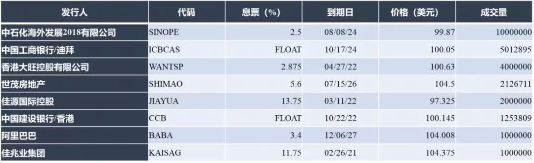 今日交易活跃债券名字SINOPE 2 ½ 08/08/24(中石化海外发展2018有限公司),ICBCAS Float 10/17/24(中国工商银行/迪拜),香港大旺控股有限公司(香港大旺控股有限公司)。