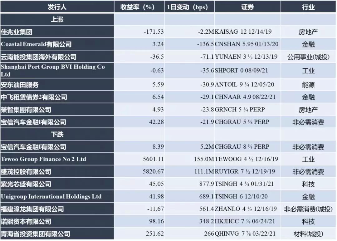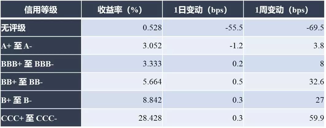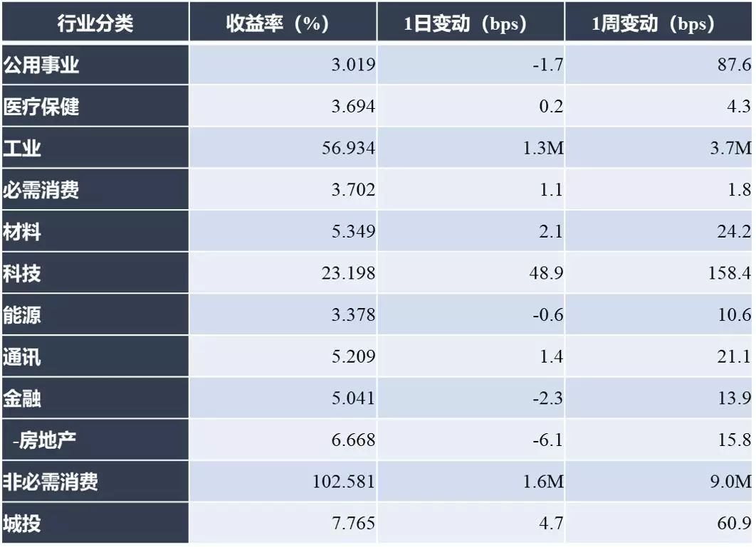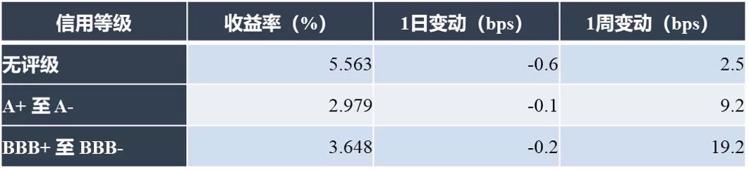 行业方面,房地产板块小幅领涨,非必需消费、工业、科技板块领跌。房地产板块主要受佳兆业集团、榮智集團等名字上涨的影响,收益率下行约6.1bps;非必需消费板块主要受广汇汽车(宝信汽车金融I有限公司)、盛茂控股、福建漳龙集团等名字下跌的影响,收益率上行近1600bps;工业板块主要受天津物产集团(Tewoo Group Finance No 2 Ltd)等名字下跌的影响,收益率上行约1300bps;科技板块主要受紫光芯盛、北大方正(诺熙资本有限公司)等名字下跌的影响,收益率上行48.9bps左右。