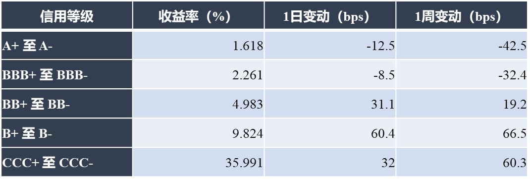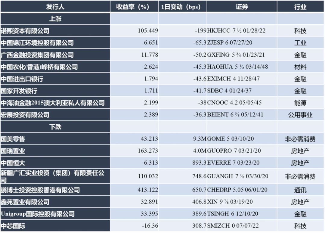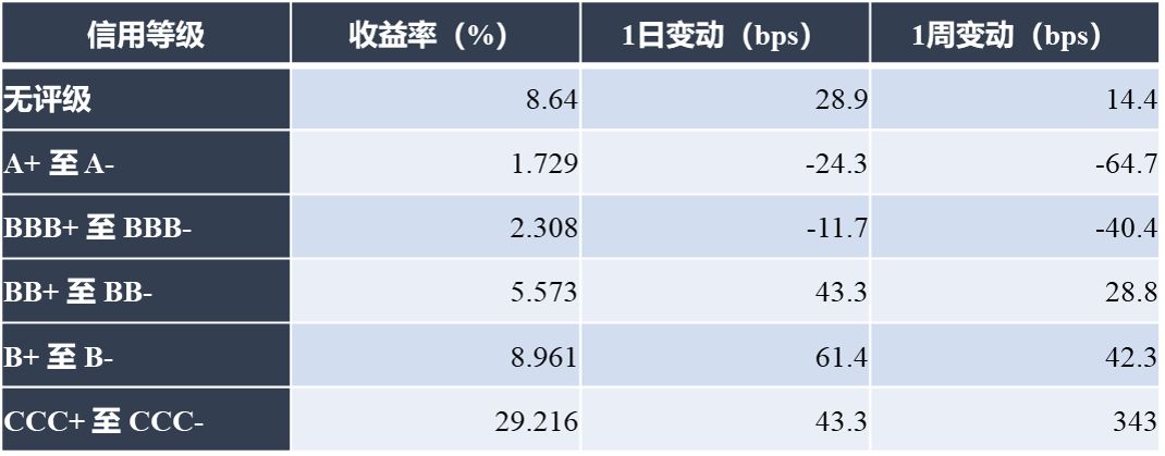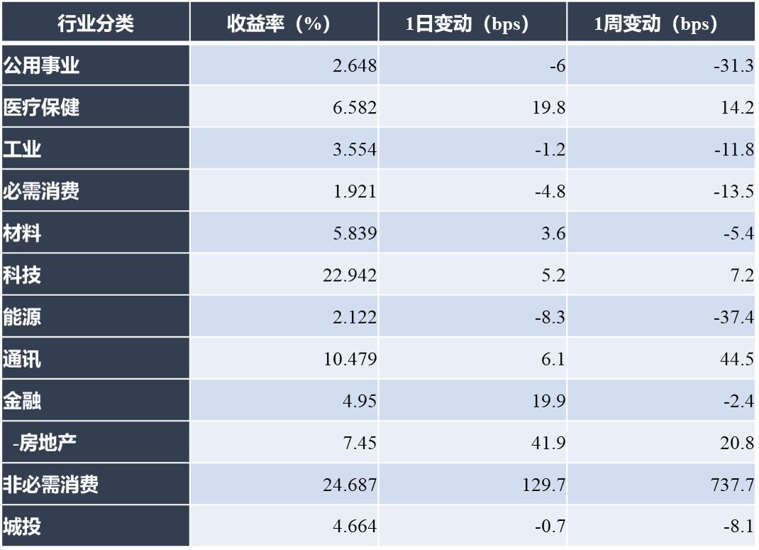 一级市场无中资企业定价。二级市场走弱,投资级名字普涨,高收益名字全面下跌;行业方面,能源、公用事业板块领涨,非必需消费、房地产板块领跌。