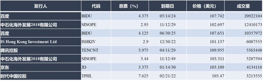 今日交易活跃债券名字BIDU 4 ⅜ 05/14/24(百度),SINOPE 2.95 11/12/29(中石化海外发展2018有限公司),BIDU 4 ⅛ 06/30/25(百度)。