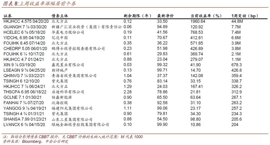 行业上,房地产方面,在2月最后一周收益率和利差整体上行后,上周板块收益率和利差中位数分别收窄20bp和走扩12bp,其中A档和BBB档收益率下行约20-22bp,BB档与B档收益率下行约18-29bp。城投收益率和利差中位数分别收窄2bp和走扩27bp,金融板块收益率中位数下行27bp。上周收益率涨幅居前的主体包括北大方正、广汇集团等。